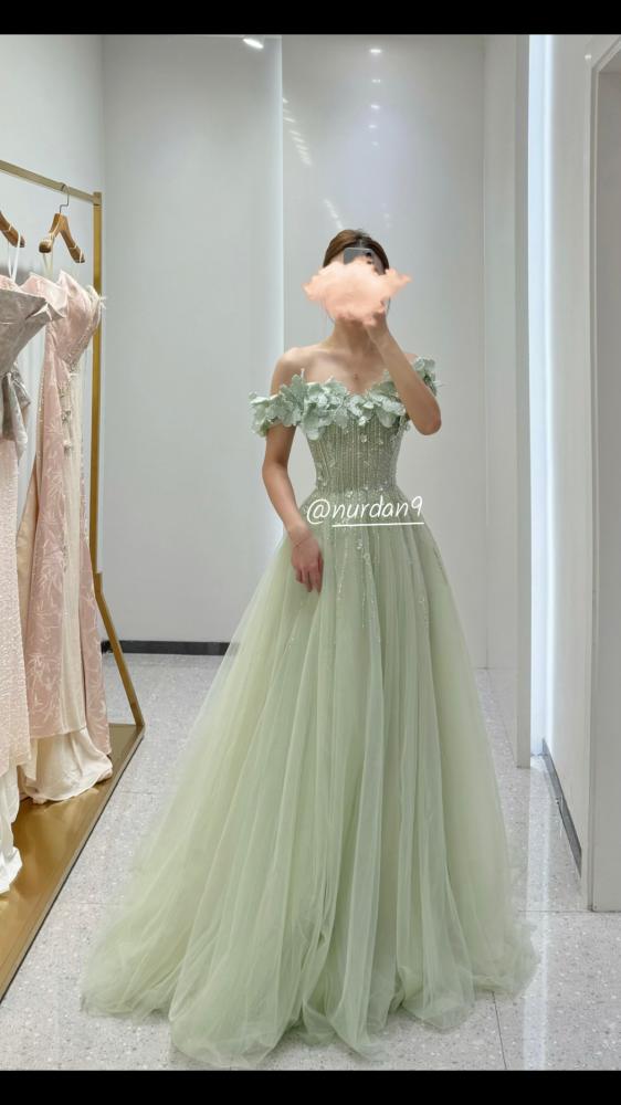 “فستان أخضر تفاحي بتصميم أنثوي راقٍ، مصنوع من قماش فاخر بانسيابية جذابة. يتميز بتطريز متناثر وورد ناعم على منطقة الصدر، مما يضفي لمسة حالمة ورومانسية على الإطلالة. الأكمام تأتي بتصميم فريد، حيث تحيط الورود الناعمة بالصدر بأسلوب أنيق يعزز من جمالية التصميم. والتنورة واسعة ومنسدلة بانسيابية لإطلالة ملكية، أو بطبقات ناعمة تضيف بعدًا راقيًا. هذا الفستان مثالي للمناسبات الفاخرة، حيث يجمع بين النعومة والفخامة بأسلوب يخطف الأنظار.”