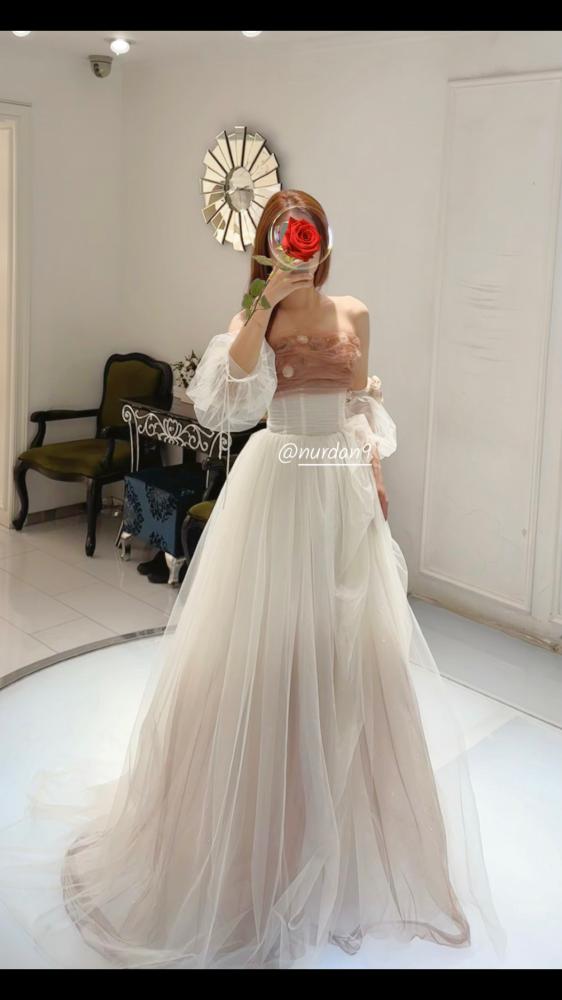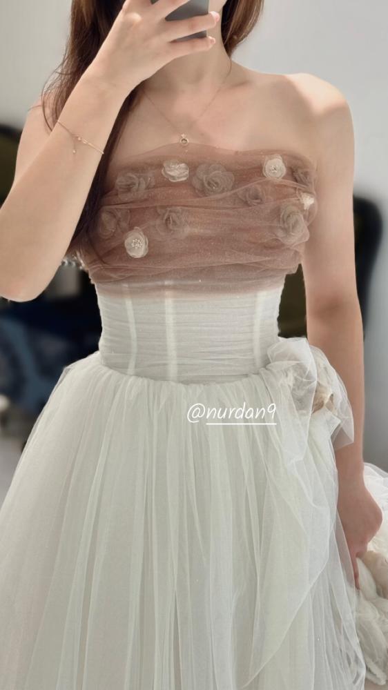 “فستان ساحر بتصميم متناغم يجمع بين درجات الأوف وايت واللحمي أو الكابتشينو في مزيج راقٍ يعكس الأناقة والفخامة. يتميز بقصة ناعمة وانسيابية تبرز أنوثة القوام برقة، مع قماش فاخر من التول الخفيف الذي يضفي لمسة حالمة على الإطلالة. يزدان الصدر بورود أنيقة موزعة بعناية، تضفي لمسة رومانسية ناعمة وتعزز من جمالية التصميم. و الأكمام شفافة لمزيد من الرقي، بينما تنساب التنورة بانسيابية تضيف لمسة ملكية ساحرة. هذا الفستان هو الخيار المثالي لمن تبحث عن إطلالة راقية وأنثوية في المناسبات المميزة.”